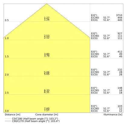 De gradenbundel geeft informatie over hoe breed het licht wordt uitgestraald. Dit zit tussen de 0 en 360 graden (D). Hoe kleiner de hoek, hoe specifieker de lichtbundel is. Over het algemeen is een smalle gradenbundel perfect voor sfeer- of accentverlichting, terwijl een brede gradenbundel ideaal is om grote oppervlaktes te verlichten.