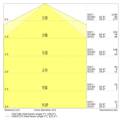 ![]() De kleurcode is een combinatie van de kleurweergave (CRI) en lichtkleur (Kelvin). Het eerste getal is de kleurweergave (1 = zeer slechte kleurweergave, 9 = maximale kleurechtheid). Het tweede en derde cijfer betreft de lichtkleur. Een lamp met kleurcode 830 heeft bijvoorbeeld een goede kleurweergave en straalt een warm wit licht uit (3000K), waar een lamp met de kleurcode 940 een uitstekende CRI heeft en een koel wit licht (4000K) uitstraalt. |